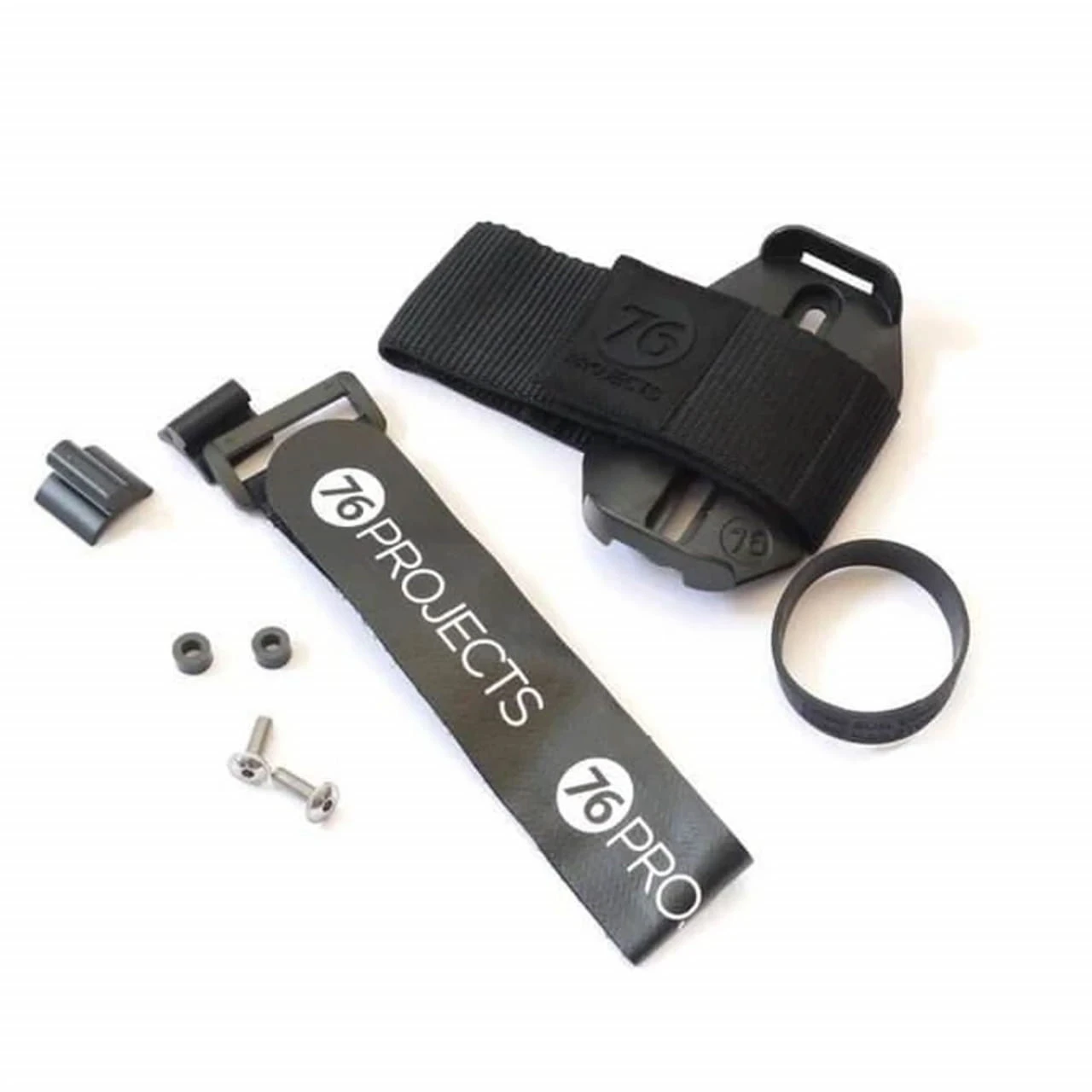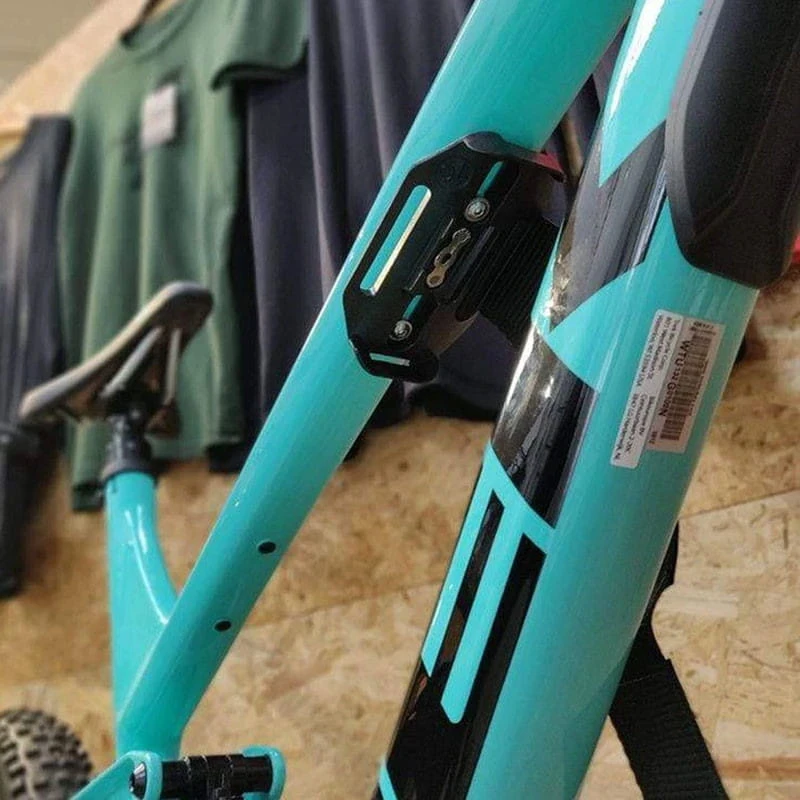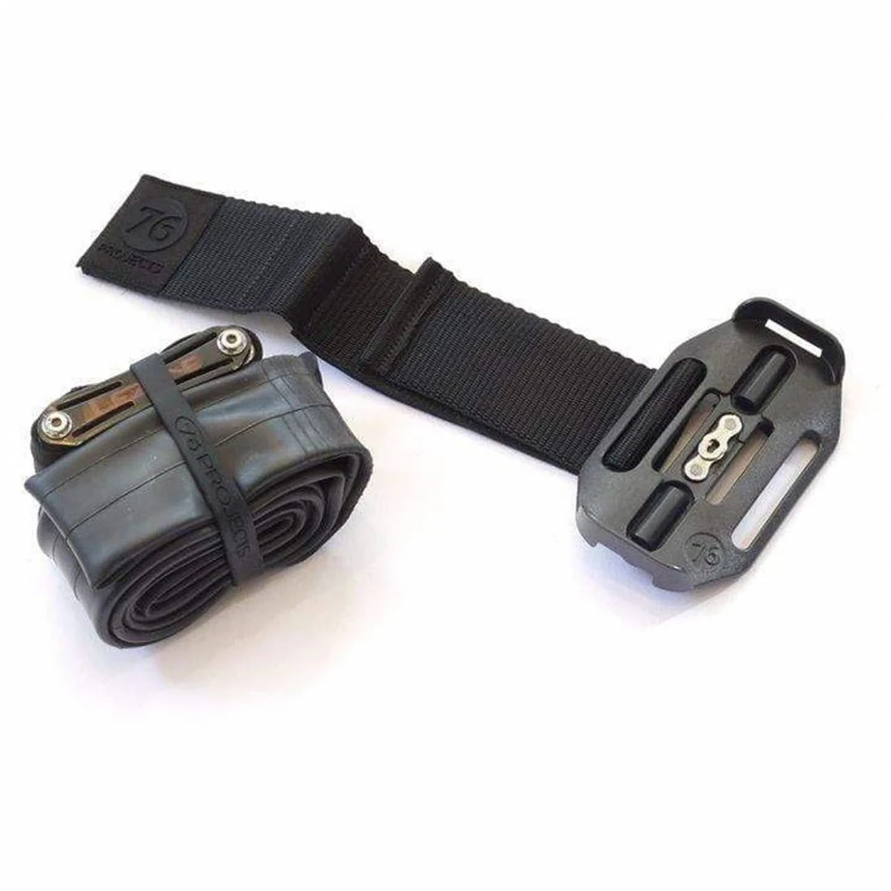 Auf der Halteplatte werden dann 29er Schlauch, Hebel, Multitool und CO2-Patronen mit einem weiterenm Klett-Strap festgeschnallt. Robuste Silikonbänder zur Verbindung der Gegenstände untereinander sind ebenfalls enthalten. Ein durchdachtes Detail: im Boden der Halterung sind Ausbuchtungen für Ersatz-Kettenschlösser eingearbeitet. Als Zubehör sind außerdem ein wetterfestes Dry Bag und ein Zip Case erhältlich, die perfekt zur Halterung passen.