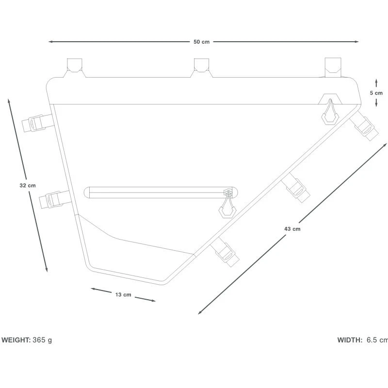Diese Rahmentasche macht sich den gesamten Raum zwischen Ober- und Unterrohr zu Nutze und schafft viel Stauraum. Damit eignet sie sich perfekt für längere Bikepacking-Touren, auf denen du auch sperrige Gegenstände wie zum Beispiel Zeltstangen oder Kochequipment brauchst. Der niedrige Schwerpunkt einer Rahmentasche ist auch für’,s Handling und den Fahrkomfort vorteilhaft, denn damit sind schwere Lasten gut verteilt. Auch für Carbonrahmen sind die Taschen der Expedition-Serie ideal: Die insgesamt acht Befestigungspunkte verbinden die Full Frame Pack-Rahmentasche sicher mit dem Rahmen, ohne das Carbonmaterial zu beschädigen.