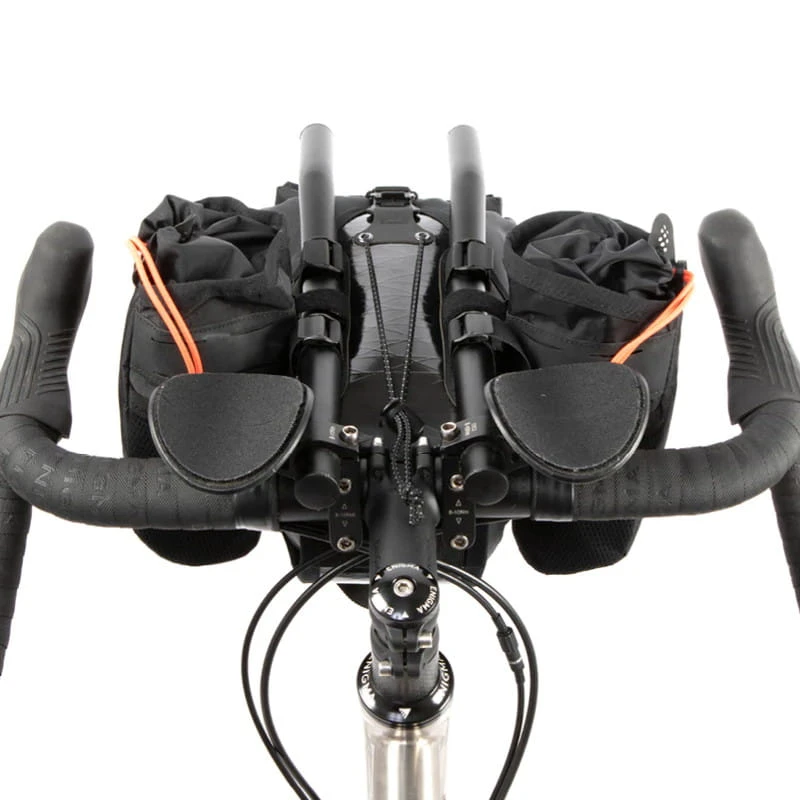 Diese Tasche wird in aufrechter Position seitlich am Cockpit gefahren. Mit drei Haltepunkten aus stabilen Klettschlaufen ergeben sich eine Vielzahl an Befestigungsmöglichkeiten. Zum Beispiel mit beiden oberen Schlaufen am Lenker und die untere am Steuerrohr. Diese ist auch lang genug, um weiter nach unten bis zur Gabel gezogen zu werden (siehe Bild 7). Die Länge ist am Verschlussclip einstellbar, damit sie gut festgezogen werden kann. Die kleine, nur 86 Gramm leichte Tasche ist eine tolle Ergänzung und kann selbst dann gefahren werden wenn die typischen Punkte im Rahmendreieck, vorne am Lenker oder über dem Hinterrad schon belegt sind. Selbst zwei Taschen sind möglich, an jeder Vorbauseite eine. Die Hülle ist aus robust texturiertem Nylon mit Kunstoffbeschichtung gemacht, so das der Inhalt zuverlässig geschützt ist und die Tasche haltbar und langlebig ist. Die Öffnung lässt sich einhändig per Kordel zuziehen. Zwei seitliche Meshfächer – praktisch für Energieriegel – runden die Tasche ab.
